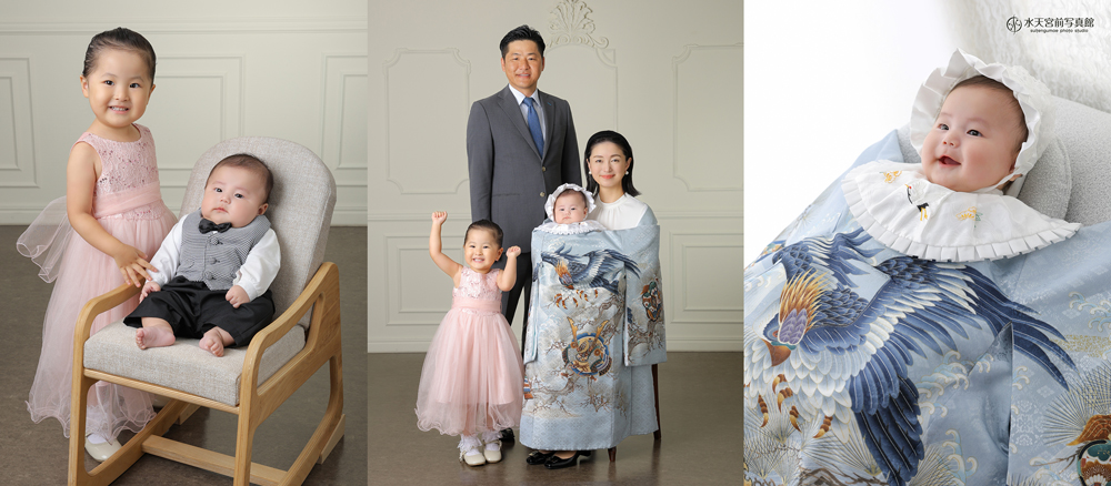 鷹の舞う水色のお宮参り着物を身にまとった赤ちゃんと、ピンクのドレス姿のお姉ちゃま🎀💗