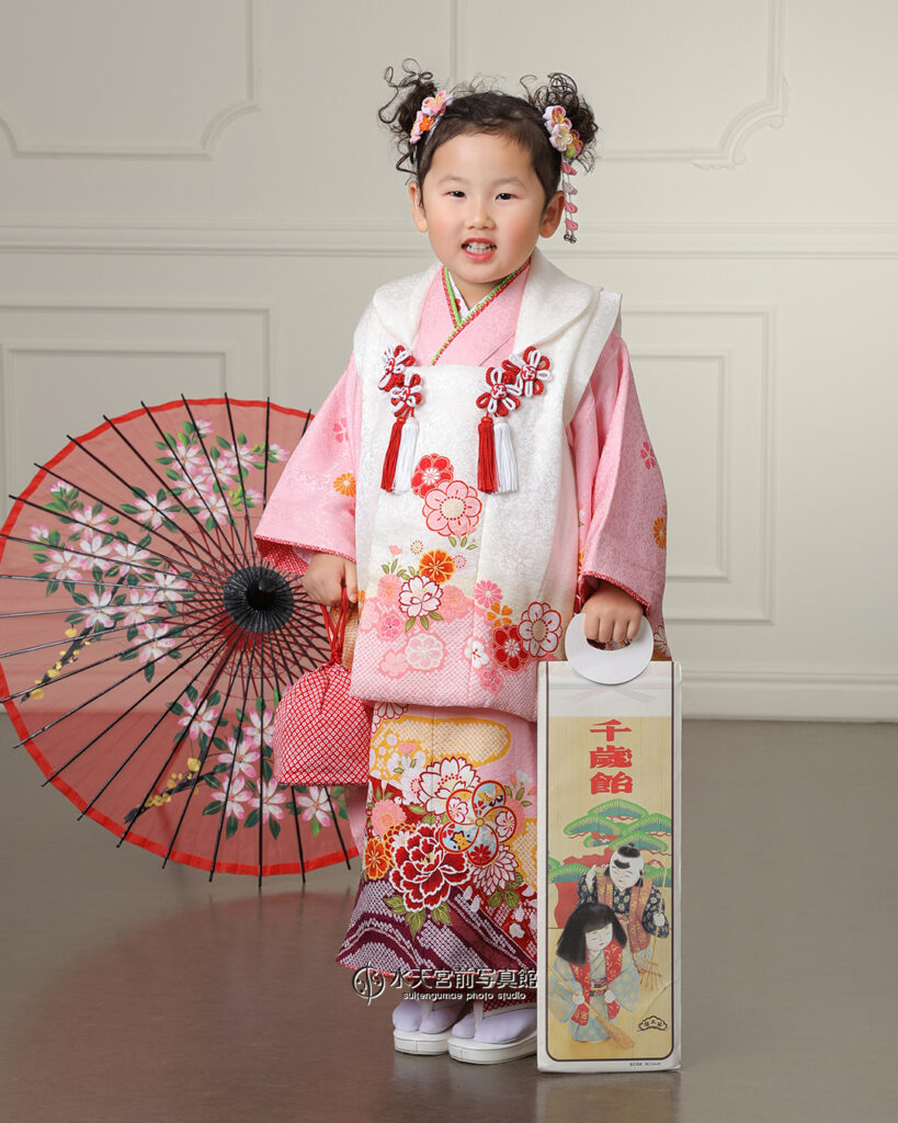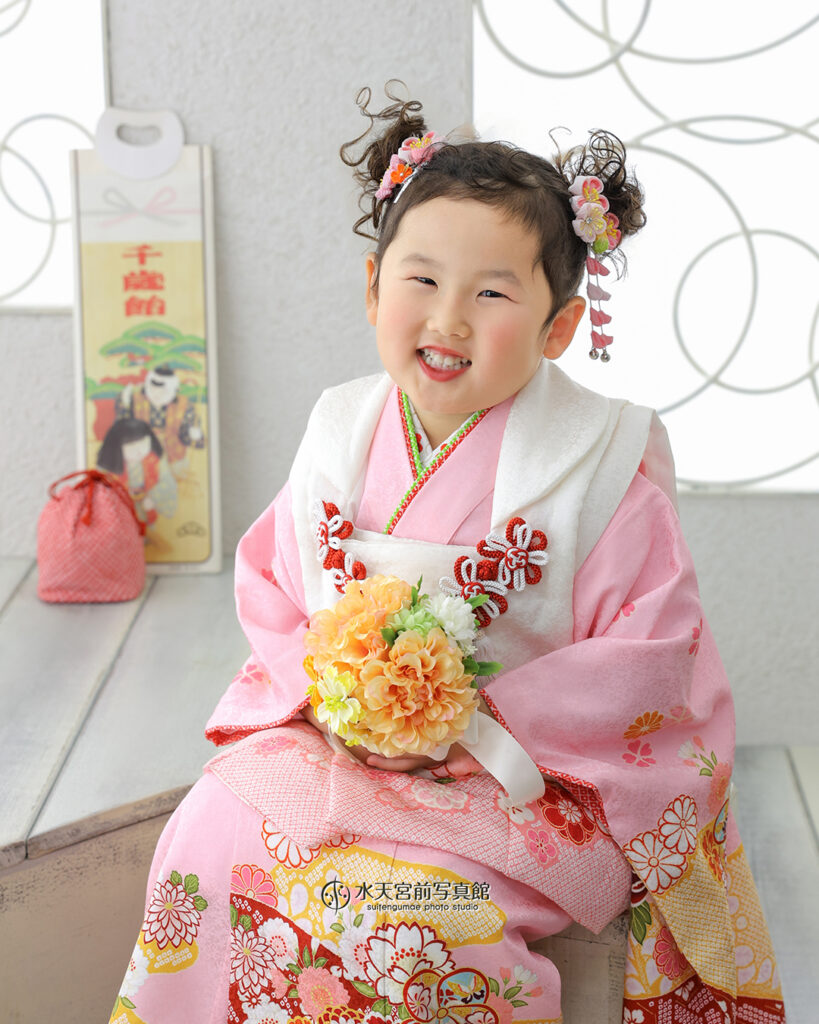 白と淡いピンクを基調にした、華やかな花々が咲き誇るお着物を着こなしてくださるお姿は