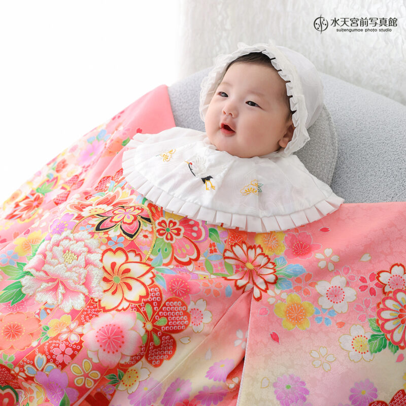 朱色の華やかな祝い着がとってもお似合い💕初宮参りおめでとうございます!