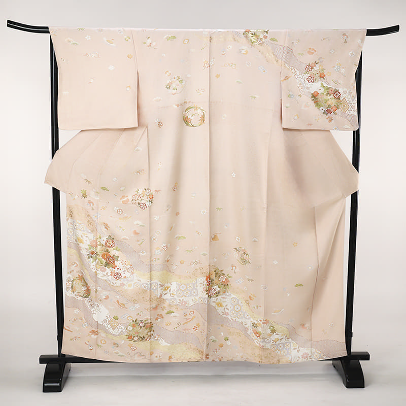 金駒刺繍をほどこしたピンクベージュ色の正絹のお着物です。