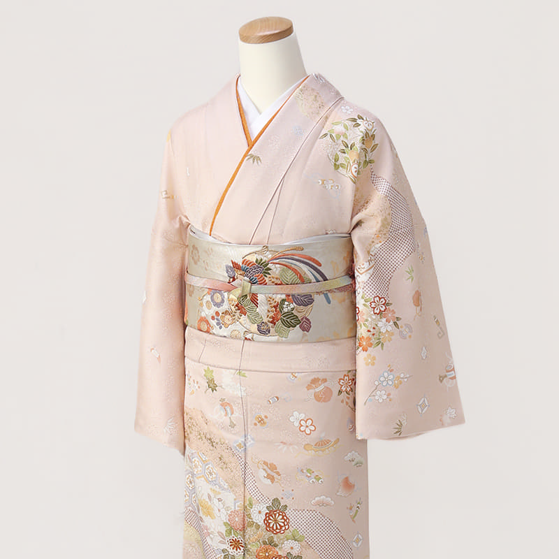 サーモンピンクの地に、松竹梅や桜を散りばめた華やかで、肌なじみのいい高級化繊のお着物です。